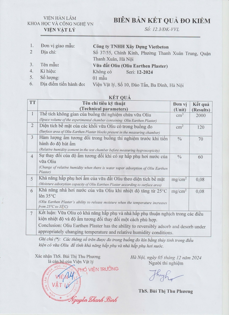 - Kết quả thử nghiệm: Kết quả thử nghiệm cho thấy Oliu Earthen Plaster có khả năng hấp phụ và nhả ẩm 0.08 mg/cm². Với 1 m² tường trát vữa Oliu, sản phẩm có thể hấp thụ/nhả 800mg hơi nước, góp phần đáng kể vào việc cân bằng độ ẩm trong không gian.